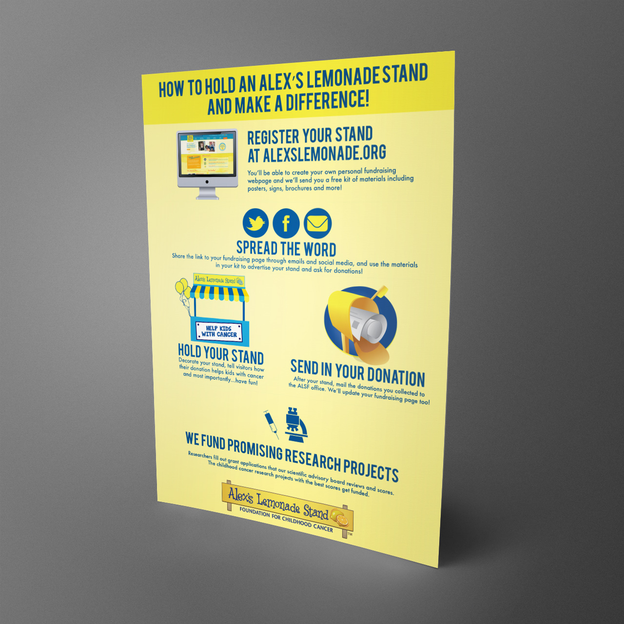 I was honored to be given the task of updating their brand. I was hired to give all of their marketing materials a facelift. I worked with the foundation for 18+ months and during that time created new visuals, messaging and templates to help improve their mission. These materials are still being used today. If you see something out and about that is ALSF related chances are I had a hand in it.